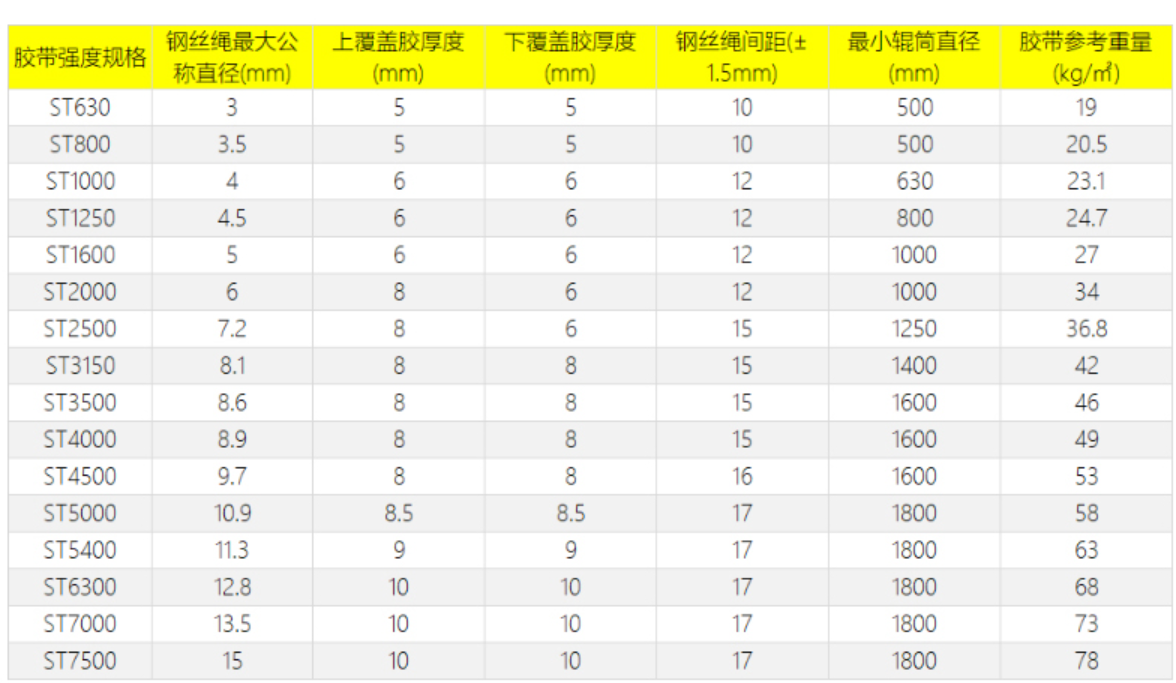GB, MT, ജപ്പാനിലെ JIS, ISO, ജർമ്മനിയിലെ DIN, ഇംഗ്ലണ്ടിലെ BS, ഓസ്ട്രേലിയയിലെ AS, ദക്ഷിണാഫ്രിക്കയിലെ SABS, അമേരിക്കയിലെ RMA, ചൈനയിലെ MASHA എന്നിവയ്ക്ക് അനുസൃതമായി സ്റ്റീൽ കോർഡ് കൺവെയർ ബെൽറ്റ് രൂപകൽപ്പന ചെയ്യാനും നിർമ്മിക്കാനും കഴിയും. ഉപഭോക്താക്കളുടെ യഥാർത്ഥ ആവശ്യങ്ങൾക്കനുസരിച്ച് നമുക്ക് രൂപകൽപ്പന ചെയ്യാനും ഉത്പാദിപ്പിക്കാനും കഴിയും. സാങ്കേതിക സവിശേഷതകൾ :